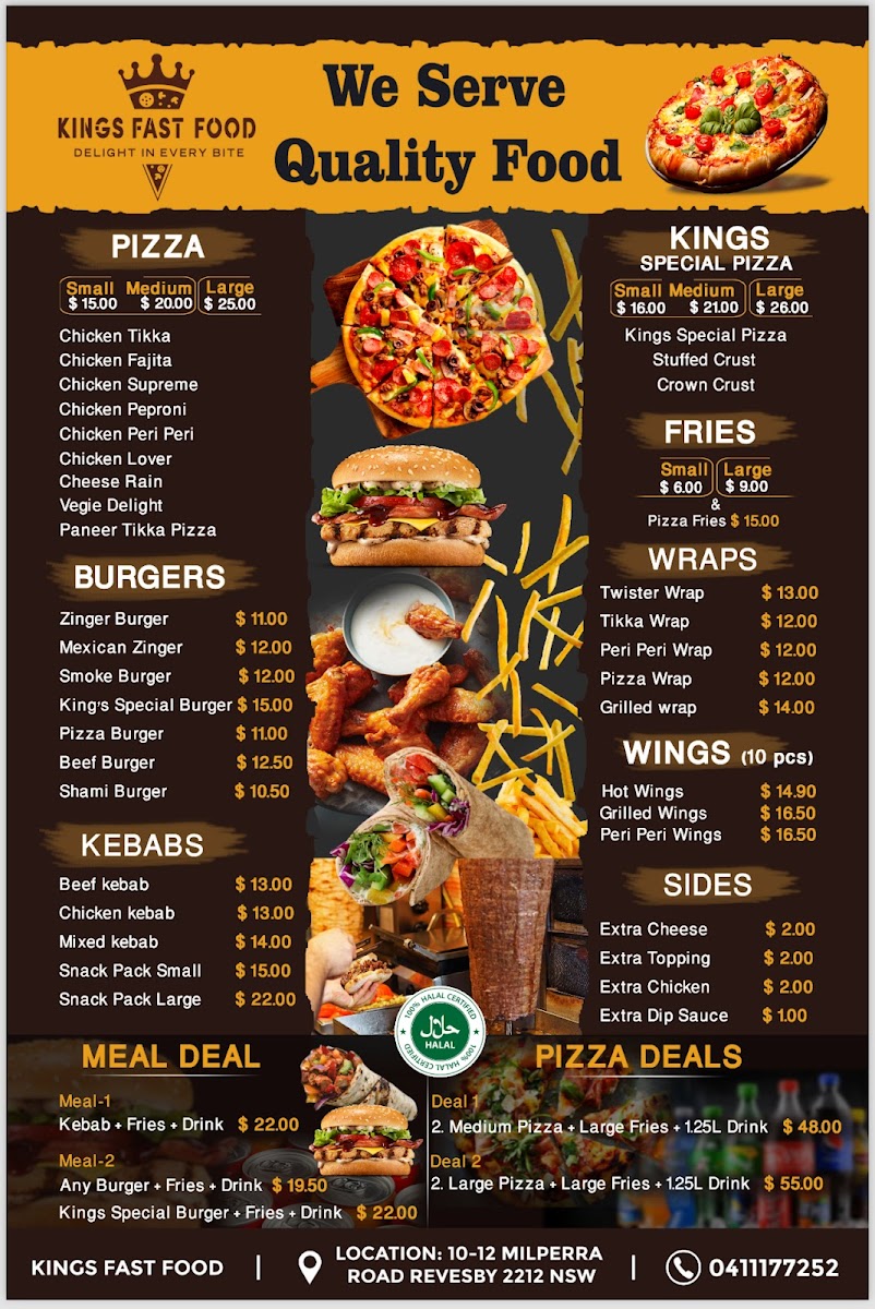 Welcome to KINGS FAST FOOD, a delightful fast food restaurant located at 10-12 Milperra Rd, Revesby, NSA 2212, Australia. Known for its inviting atmosphere and exceptional service, KINGS FAST FOOD offers a mouth-watering menu that features a range of tantalizing pizzas, burgers, and wings.